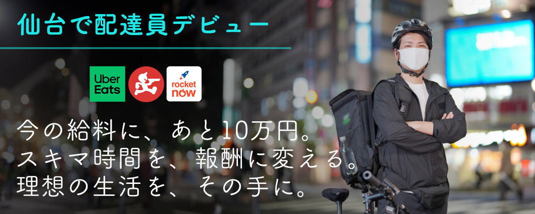 「派遣の休みの日と、平日の夜数時間だけで先週は50,000円。仙台は断然Uberが鳴りますが、出前館とロケットナウを組み合わせることで、鳴らない時間がほとんどないのが強み. 月5万から10万の副収入なら、今の仙台市場なら余裕で達成圏内です。」(20代・派遣社員)